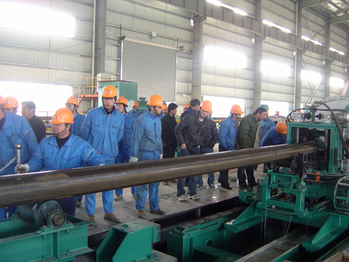 ERW219項目主設(shè)備引進青島昊坤重型機械技術(shù)有限公司國內(nèi)一流的自動化生產(chǎn)線,引進沈陽新瑞特機電設(shè)備有限公司國內(nèi)一流的銑切鋸設(shè)備,還配套了鞍山長風(fēng)無損檢測設(shè)備有限公司在線板探、在線焊縫及離線焊縫超聲波檢測設(shè)備。車間主要生產(chǎn)Ф89-219mm,鋼級Q235-X70,產(chǎn)品品種為油井套管、小口徑厚壁管。一期工程(年產(chǎn)8萬噸Ф219mmERW油氣管生產(chǎn)線)順利完工,為二期工程(年產(chǎn)12萬噸國內(nèi)最先進的鋼級達X80的螺旋縫埋弧預(yù)精焊油氣管生產(chǎn)線)的實施奠定了扎實基礎(chǔ)。