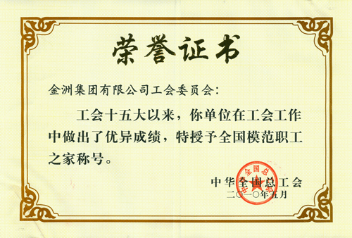 近日,金洲集團工會委員會被中華全國總工會授予2010年“模范職工之家”榮譽稱號,這是中國工會系統的最高榮譽,也是繼2005年集團工會被評為“浙江省模范職工之家”后獲得的又一殊榮。