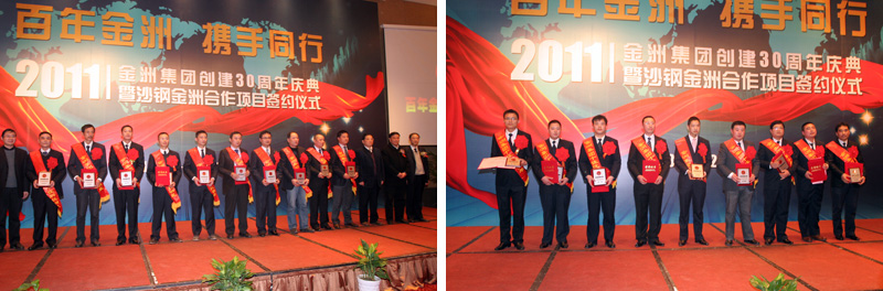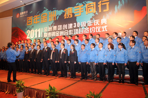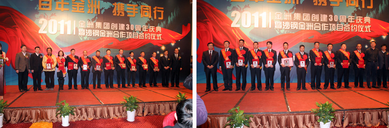 2011年12月20日下午,金洲集團(tuán)創(chuàng)建三十周年慶典暨沙鋼金洲合作項目簽約儀式在湖州雷迪森大酒店隆重舉行。湖州市委書記、市人大主任孫文友,陸軍第一集團(tuán)軍參謀長陳道祥少將,副市長周杰,市政協(xié)副主席、工商聯(lián)主席曹德平和吳興區(qū)委書記施根寶、區(qū)長蔡旭昶等主要領(lǐng)導(dǎo)及老干部代表出席大會;中海油能源發(fā)展公司總經(jīng)理閆嗣伶,沙鋼集團(tuán)總裁龔盛、投資部長錢正,金洲集團(tuán)董事局領(lǐng)導(dǎo)、中海金洲和湄公河公司領(lǐng)導(dǎo)班子、50位先進(jìn)人物及員工代表參加了慶典大會。