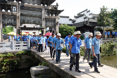 離開涇縣,公司黨員們又來到了績溪縣龍川村。在景區入口處,一面巨型黨旗讓紅色旋律響徹云霄,又正值當地村民正在進行舞龍表演,充分感受到了和諧之源的文化魅力。龍川村由于特殊的地理環境和綿長的歷史文化淵源,形成了獨特的自然和人文景觀,有江南第一祠、木雕藝術博物館、民族藝術殿堂等——胡氏宗祠,又有“天工人可代,人工天不如”美譽的奕世尚書坊,山環水繞的秀麗風景加上雕刻精湛、造型美觀的徽派建筑,使大家從徽州文化之中領悟了中華傳統文化的博大精深、千古靈氣。
