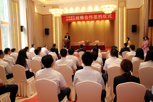 簽約儀式于下午4點在西湖國賓館1號樓隆重舉行,平安銀行總行行長邵平、副行長馮杰,集團董事長俞錦方、總裁周新華、副總裁徐水榮等領導出席,平安銀行杭州分行行長李海明主持儀式。