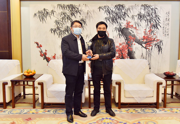 余勝奎書記向俞錦方董事長頒發“2019年度億千貿易獎”