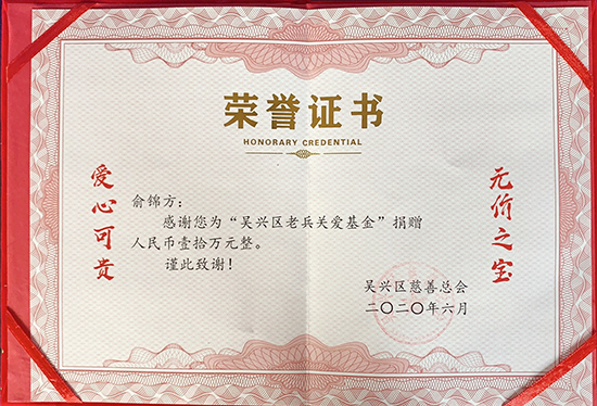 俞錦方董事長個人向吳興區(qū)老兵關愛基金捐贈10萬元
